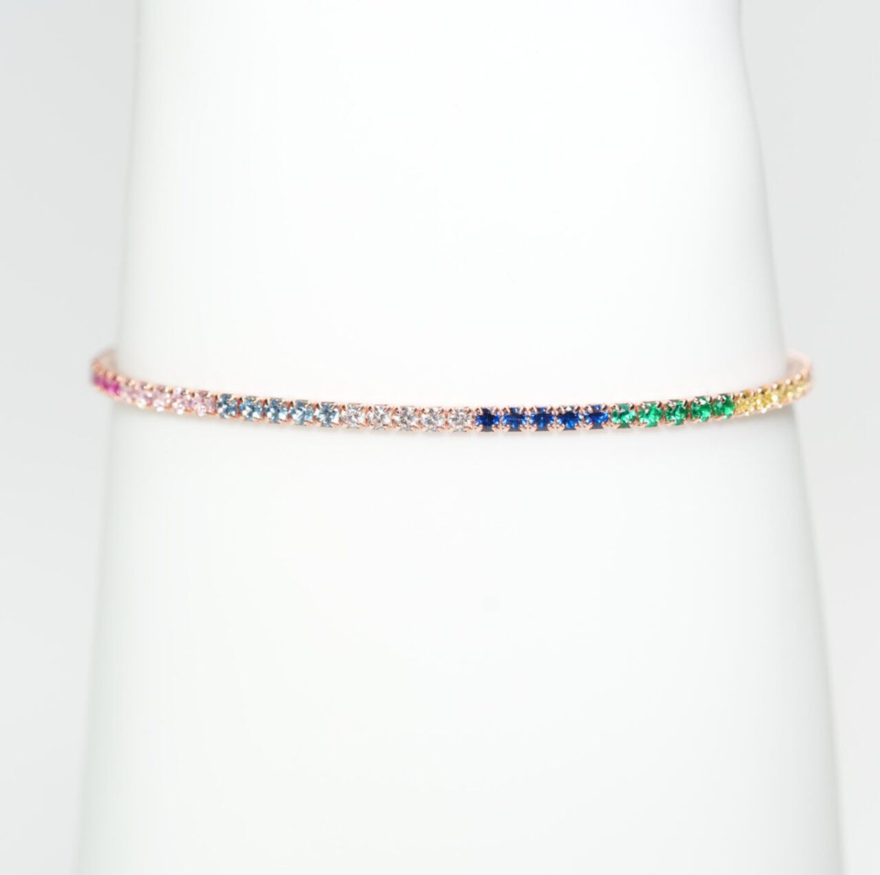 "とてもシンプルなので、モチーフジュエリーにもパールにも合わせやすく、また装いも選ばず、プラスするだけで瞬時に手元を明るくしてくれます。石は爪留めなので本物のように美しく輝きます。シンプルなので重ね付けもOK。"